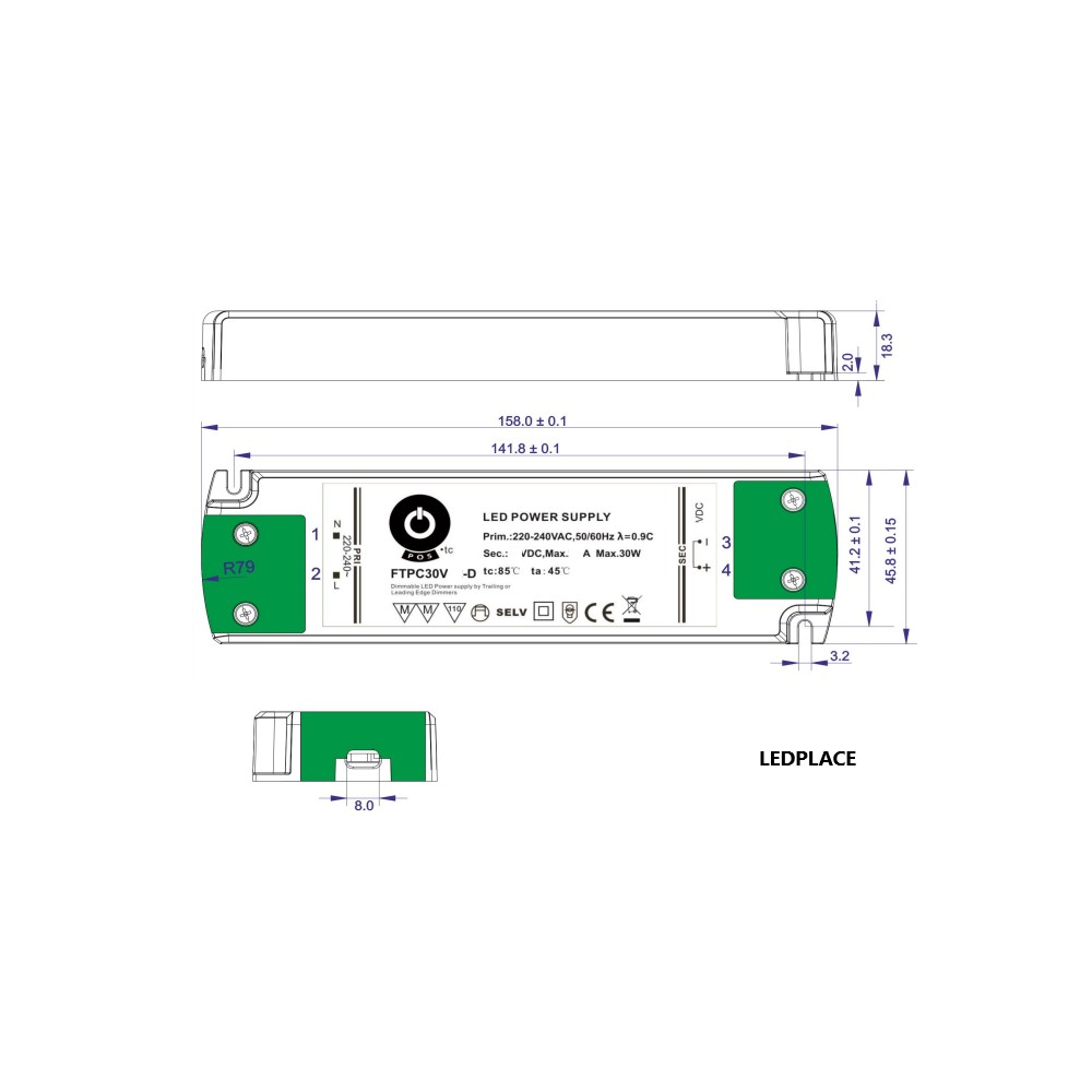 LED drivdon dimbar med dimmer (Triac), 30W 24VDC.